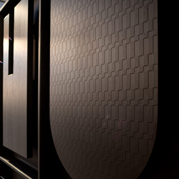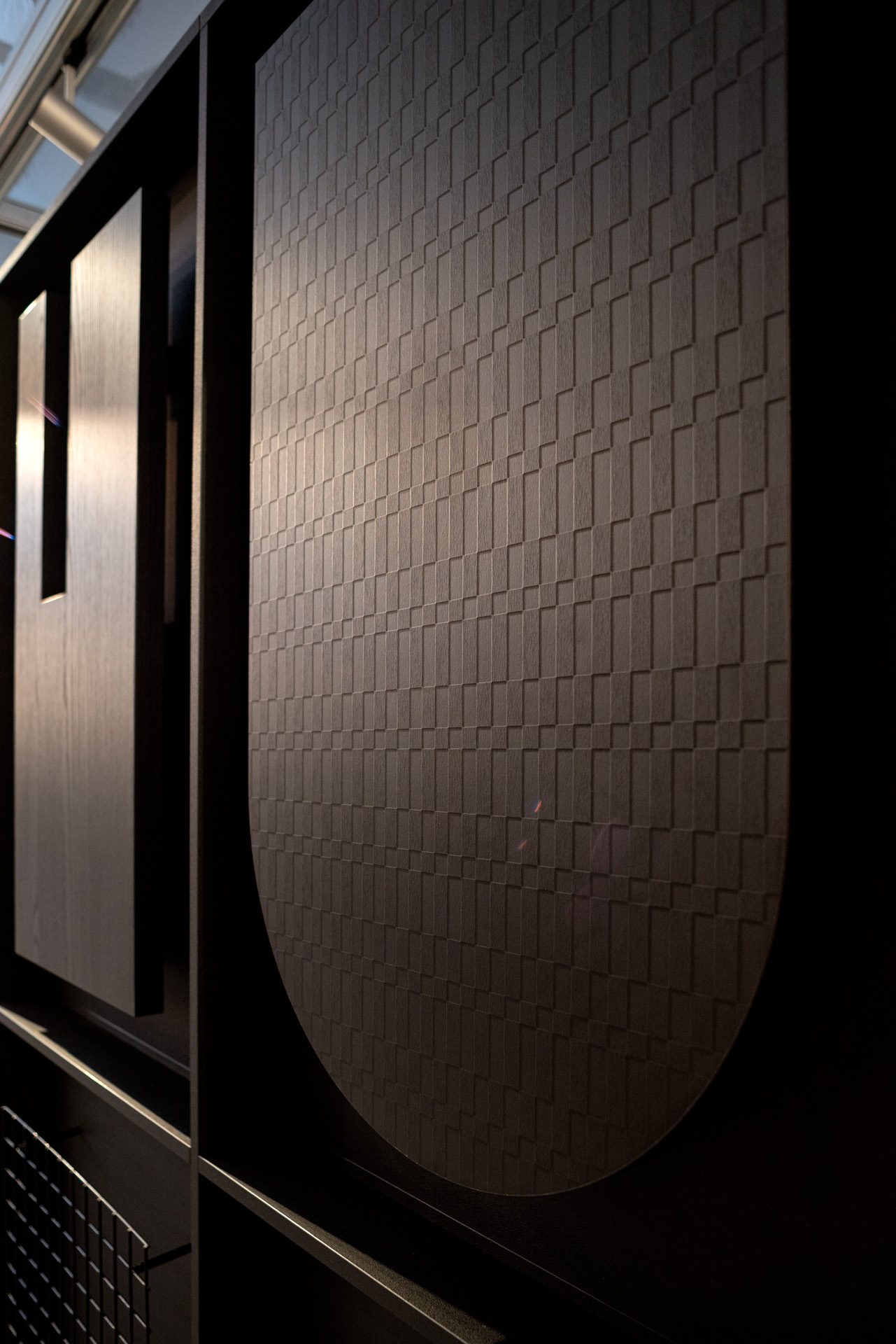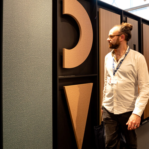 Nowe produkty prezentowane na centralnej ścianie stoiska eksplorują nowe możliwości w projektowaniu wnętrz: od uroku szkła z recyklingu i opalizującego jedwabiu, po elegancję esencji drzew cedrowych i orzecha. Każda powierzchnia przywołuje naturalne elementy, oddając hołd ich duchowi.