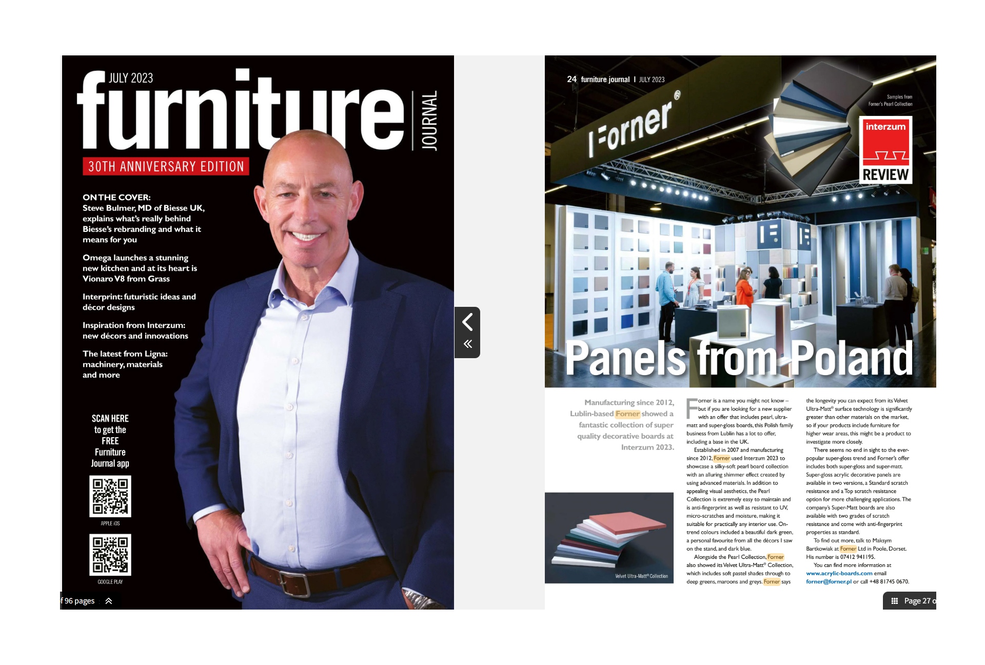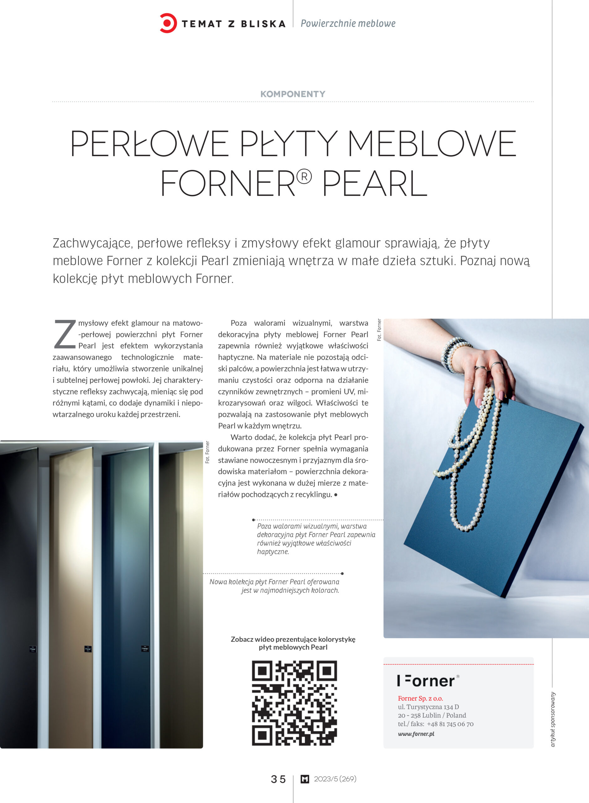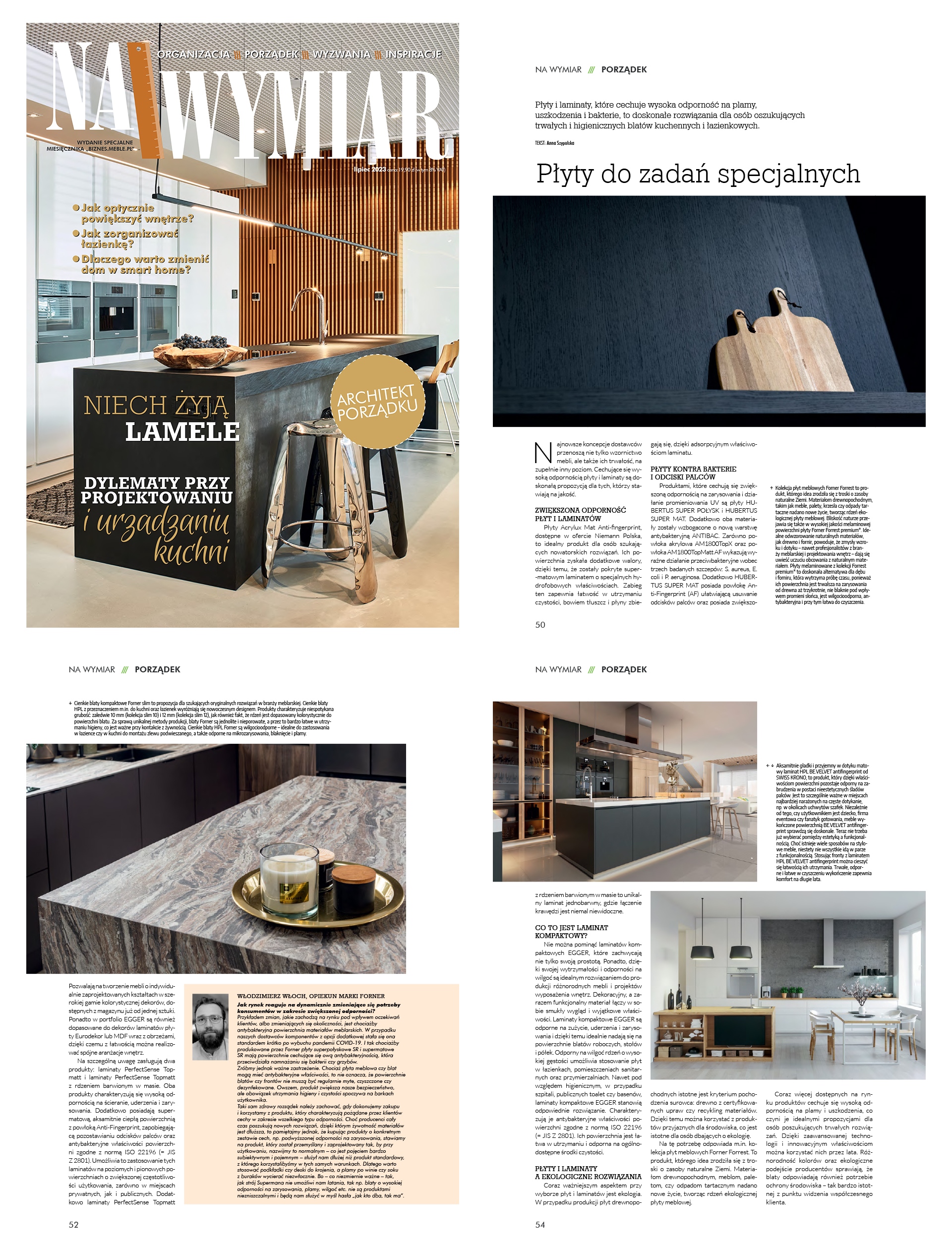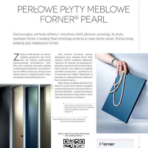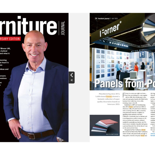 Warta odnotowania jest również pierwsza okładka w historii Forner. Na pierwszej stronie czerwcowego numeru magazynu Meblarstwo Komponenty i Technologie pojawiło się zdjęcie prezentujące płyty meblowe Pearl. – Każdy artykuł poświęcony naszym produktom w branżowej prasie to jakby drobne wyróżnienie, pochwała i dowód na to, że nasze wysokiej jakości materiały meblarskie zwracają uwagę ekspertów i pasjonatów designu – mówi Włodzimierz Włoch.
